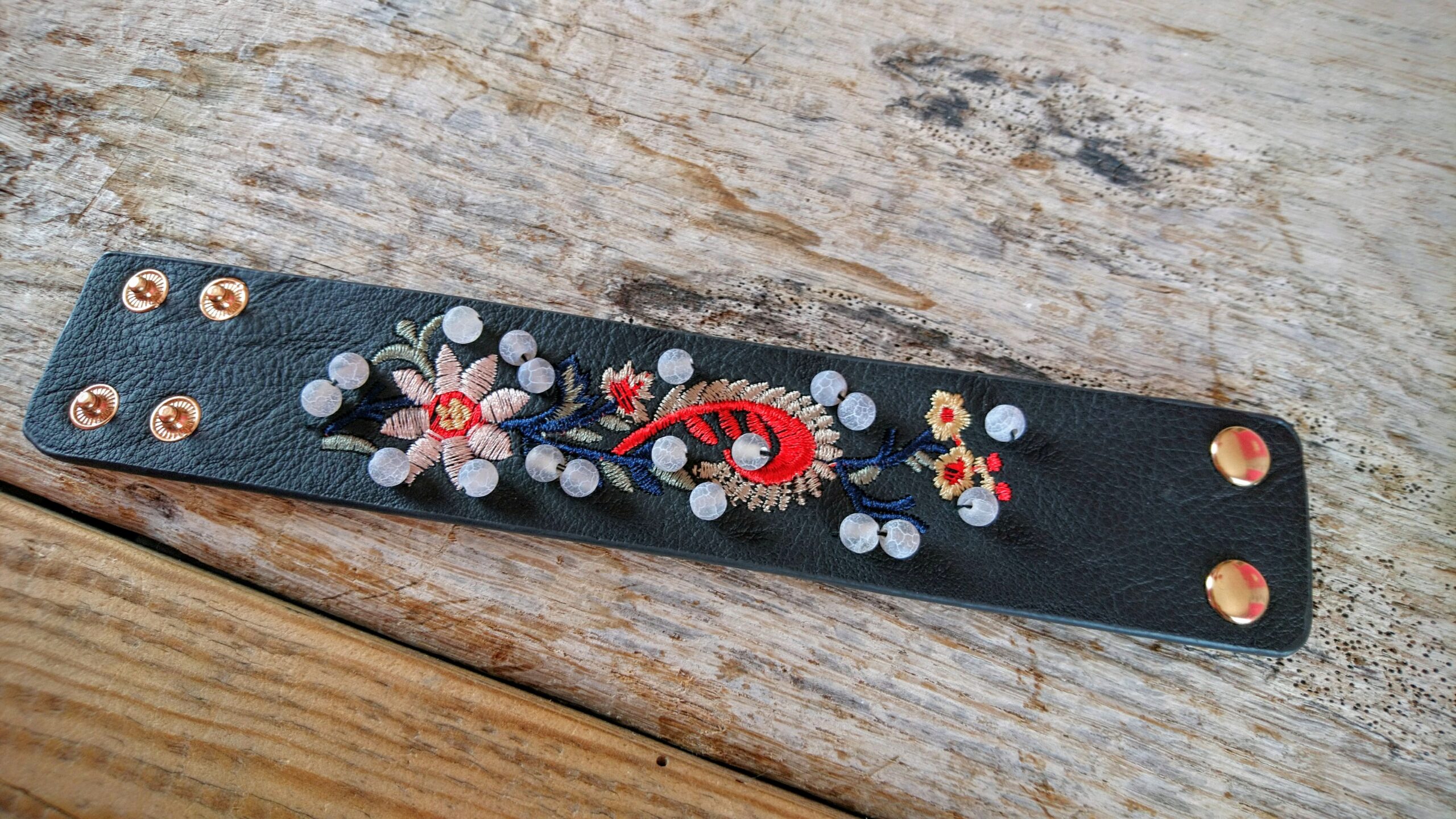 Kristallide ja tikandiga mustast nahast käevõru/käerihm