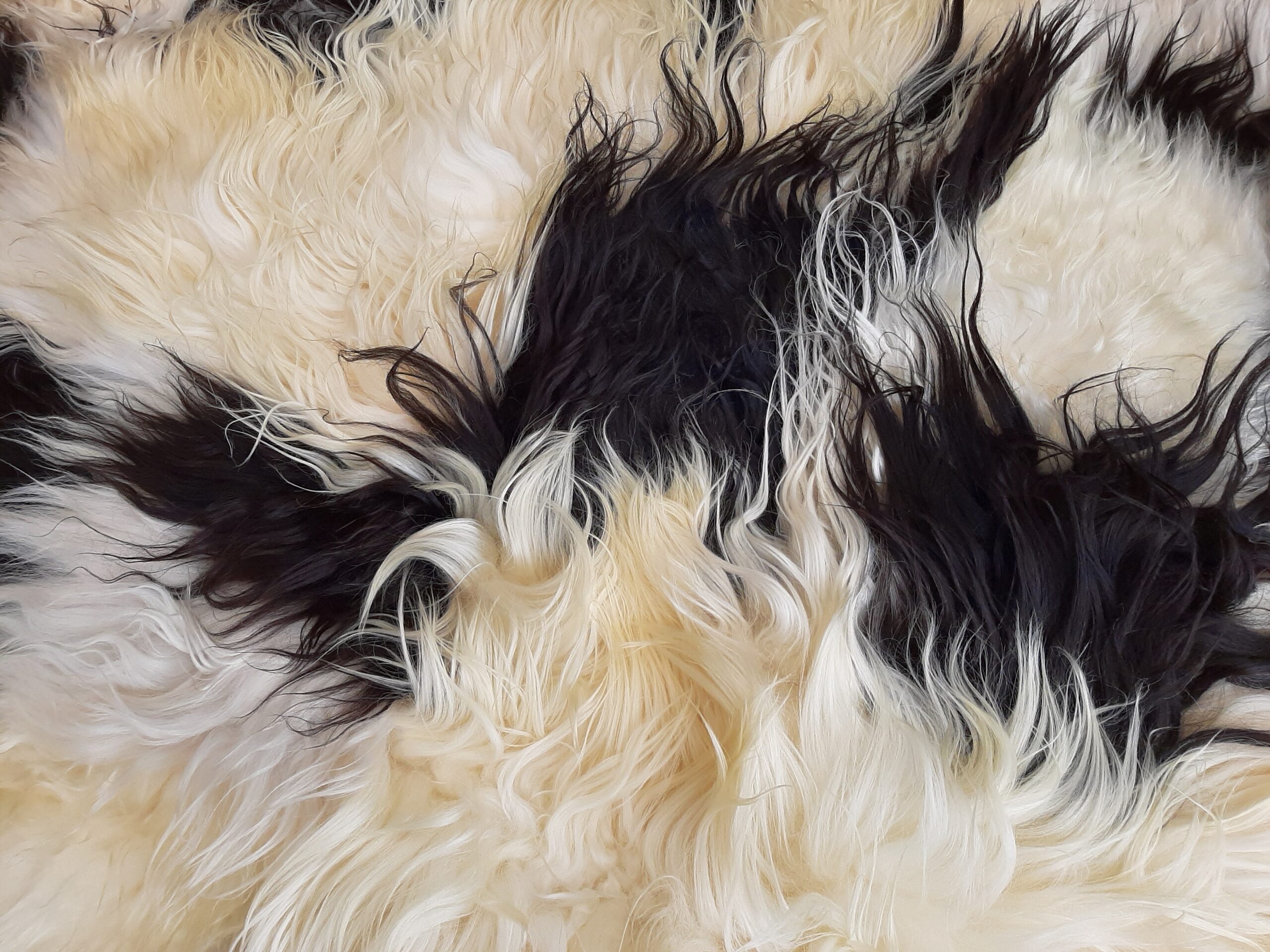 Efektne lambanahast tekk/vaip on kokku õmmeldud valget ja musta värvi eri pikkuses karvaga lambanaha tükkidest. Osad tükid on eriti pika karvaga.