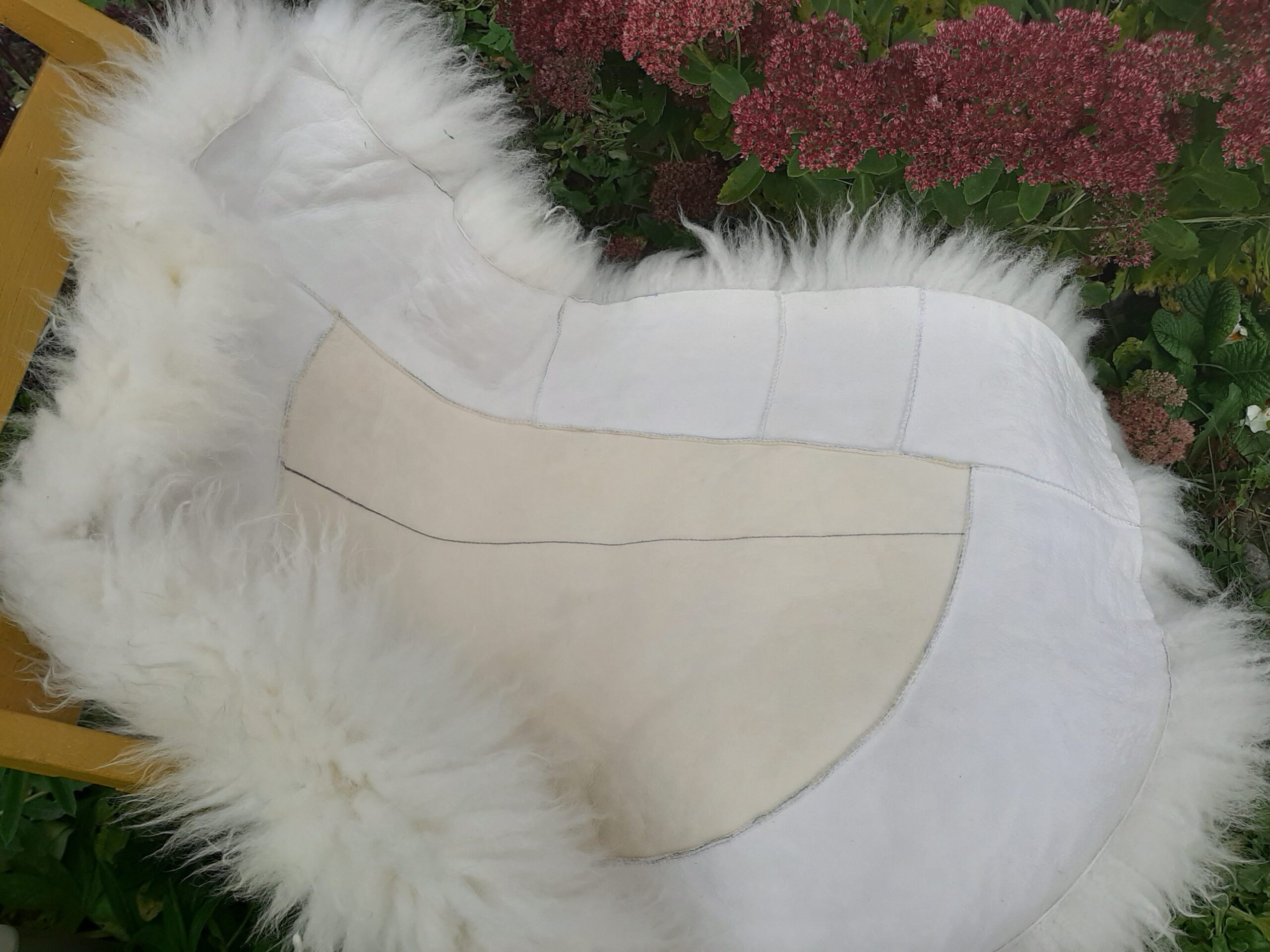 Äärtel kohevast valgest ja keskel poolkuu-kujulisest lühema karvaga kollakast lambanahast istumisalus, toolikate vm.