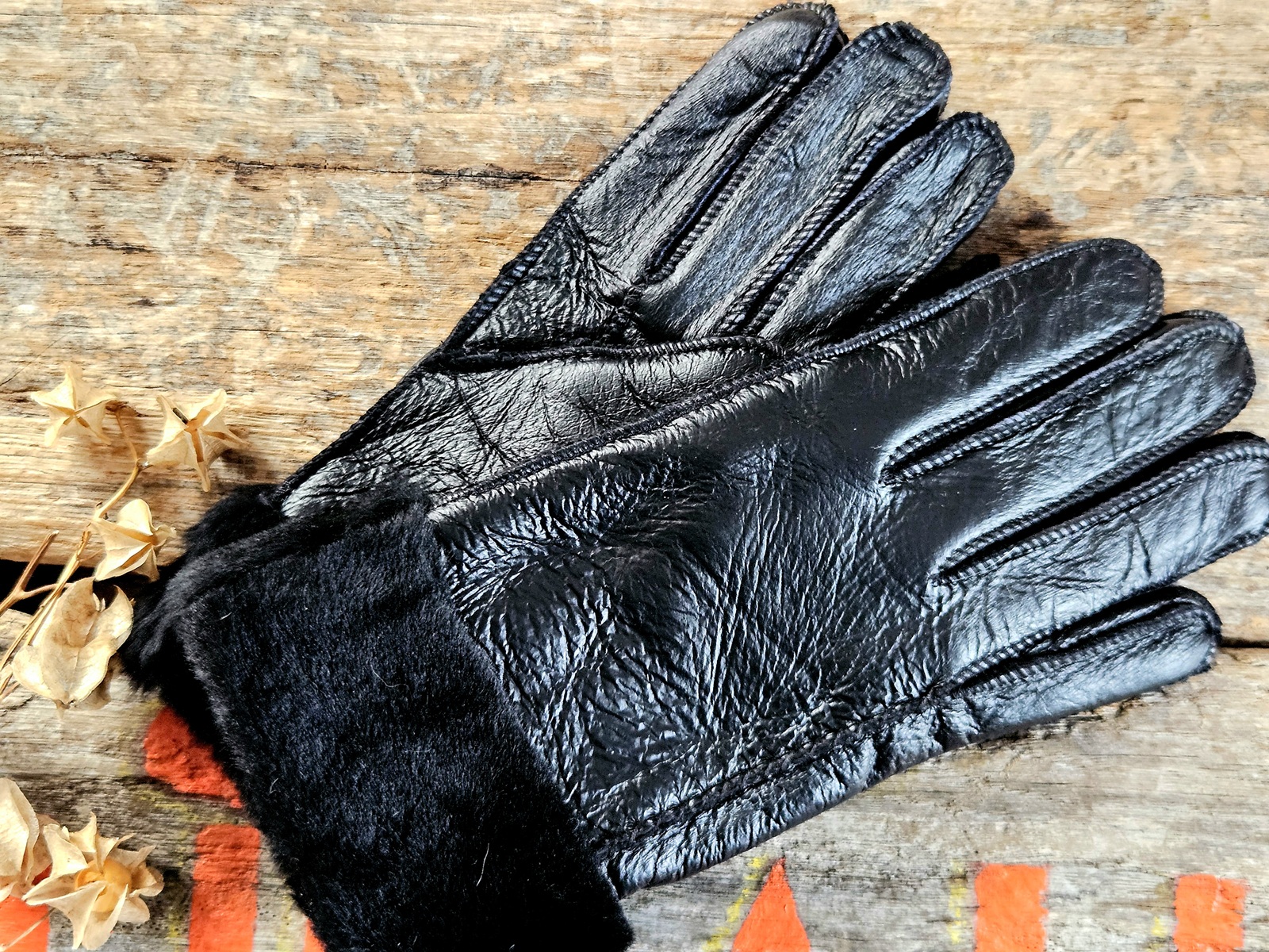 Mustad naiste nahkkindad, mis on valmistatud nii pealt kui seest pehmest lambanahast. Voodri pügatud ja värvitud karv on keeratud randmele kaunistuseks ja sooja andmiseks.