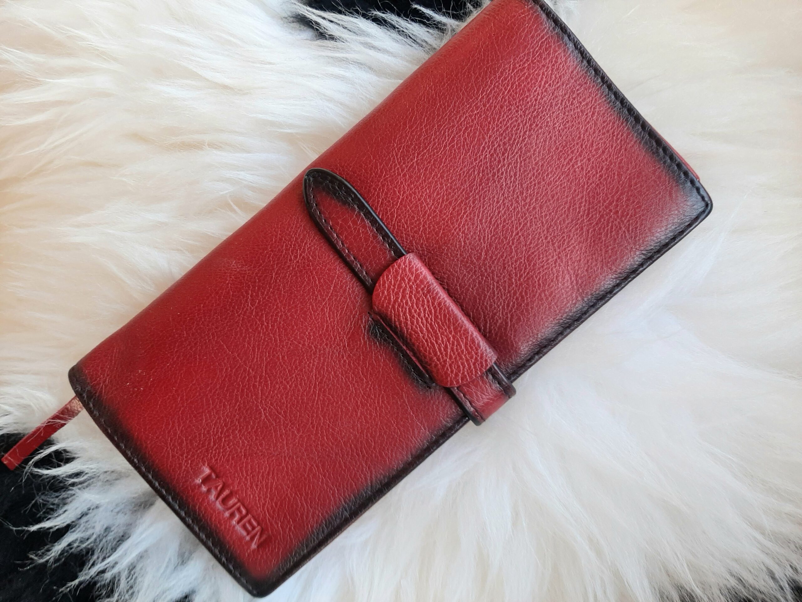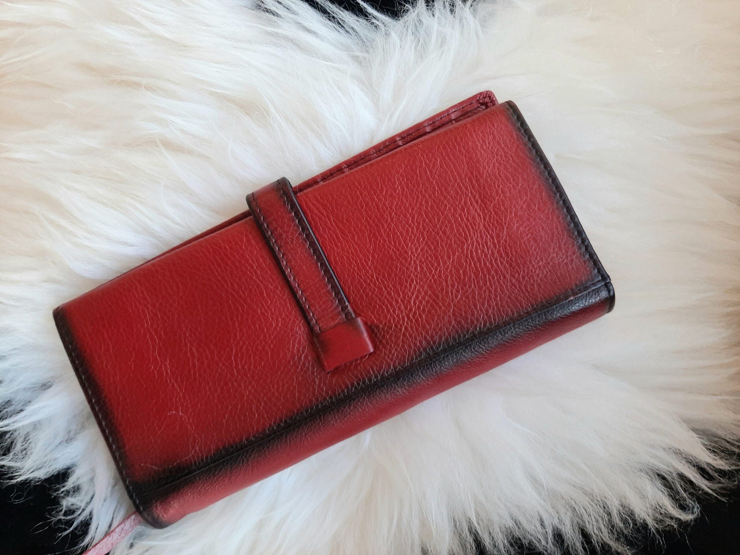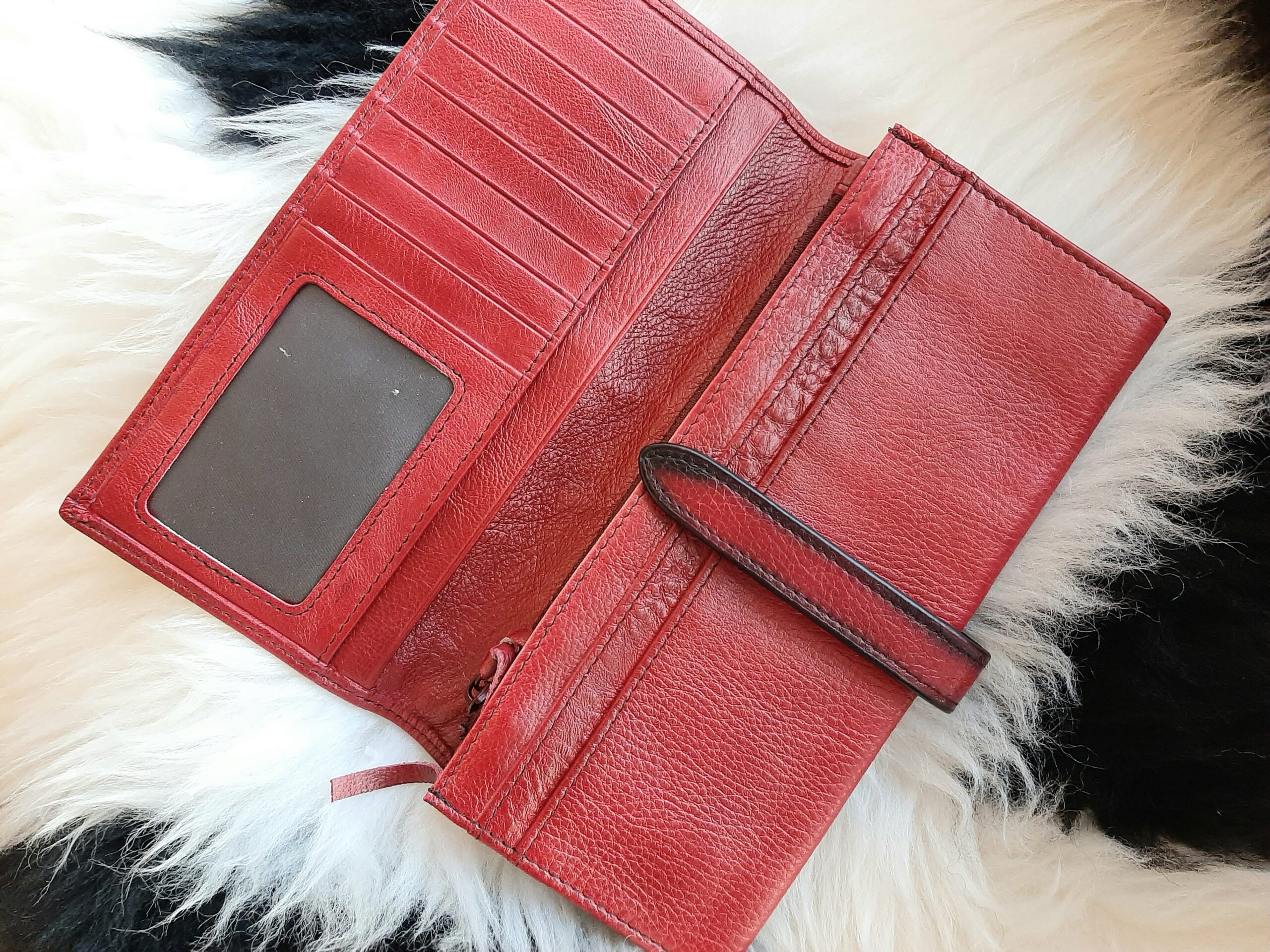 Punasest pehmest nahast musta varjunditega suuremas mõõdus rahakott. Omapärane rihma ja aasaga kinnitus pealsel. Sees 12 kaarditaskut, lukuga münditasku, 2 suurt vahet sularaha jaoks. Pealsetel tepingud.