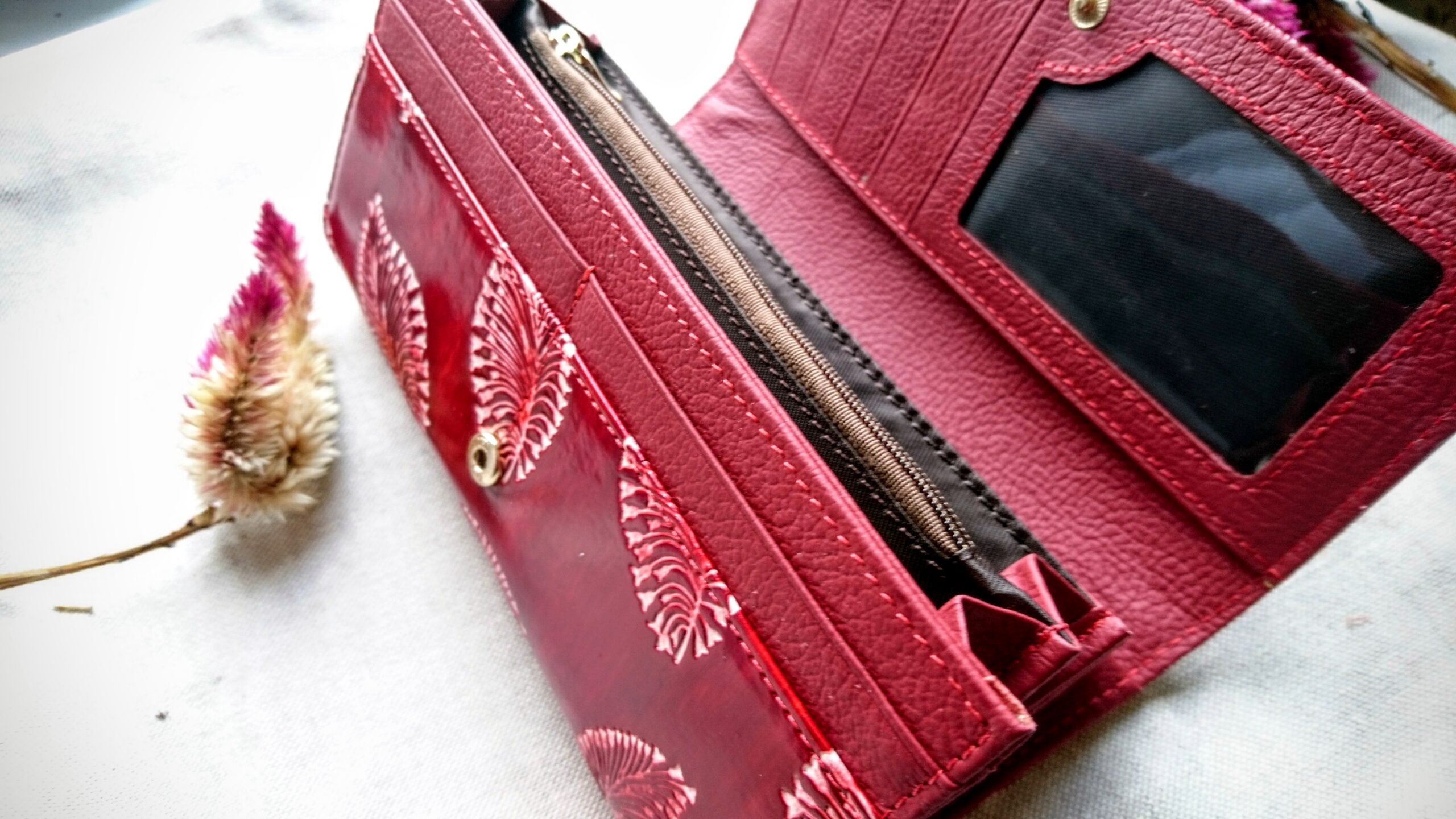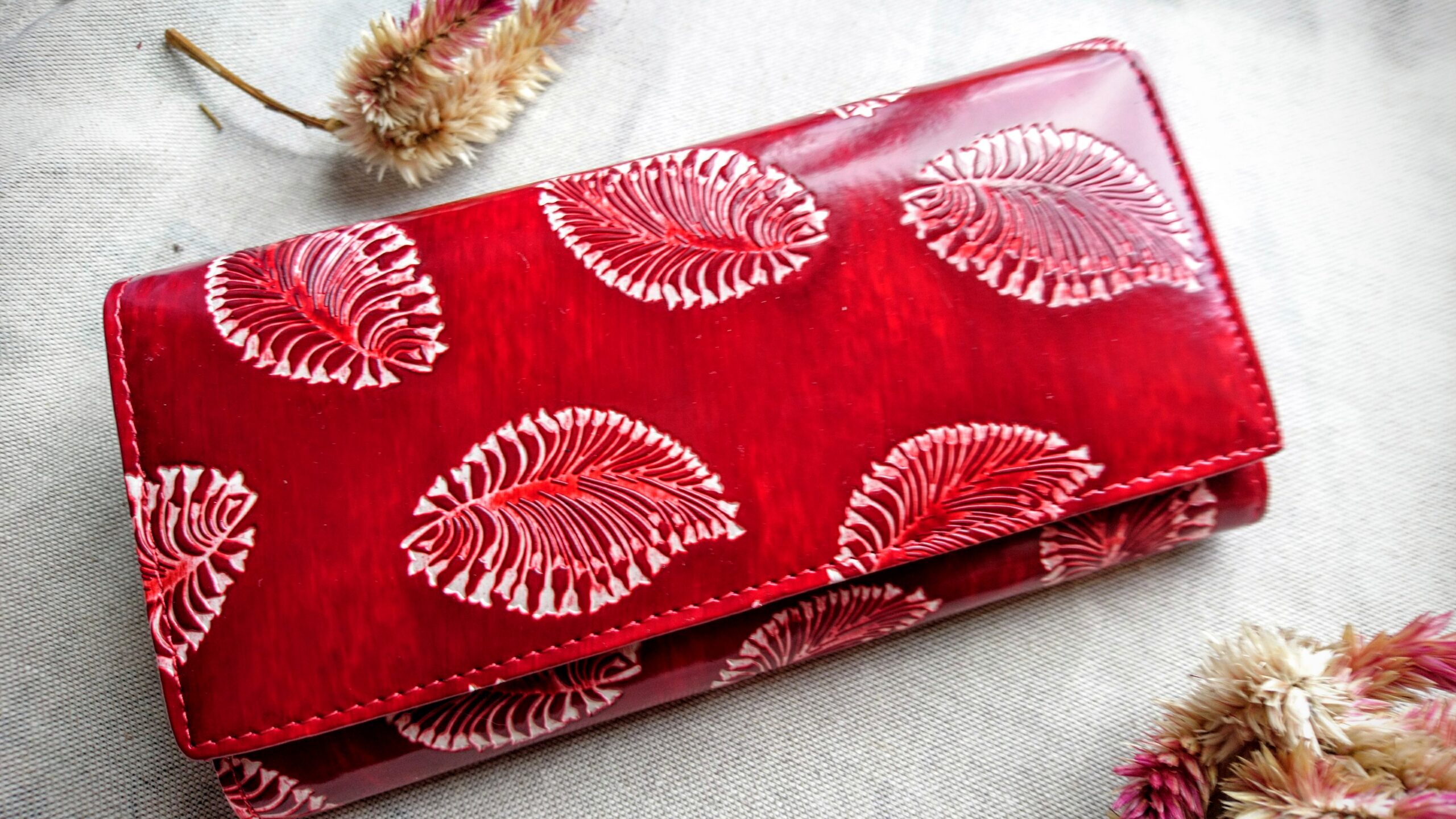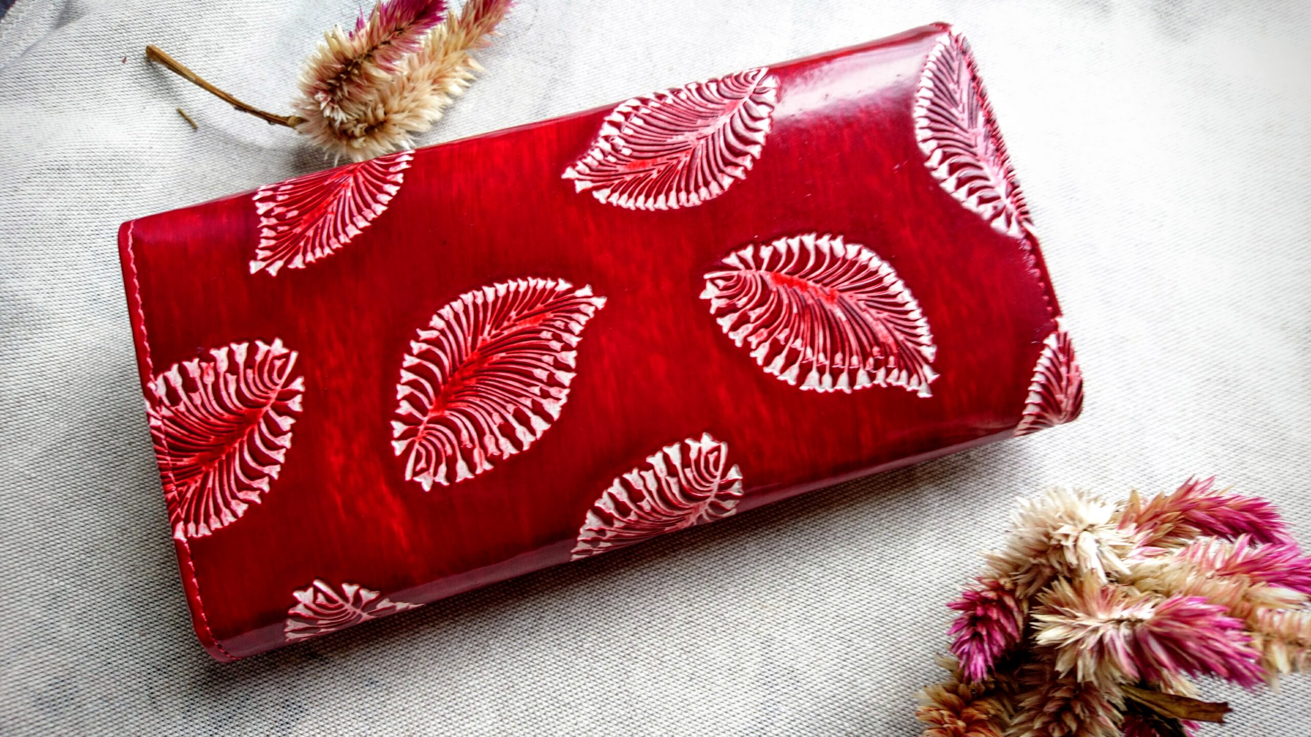 Punasest täisnahast rahakott naistele valgete sulgedega