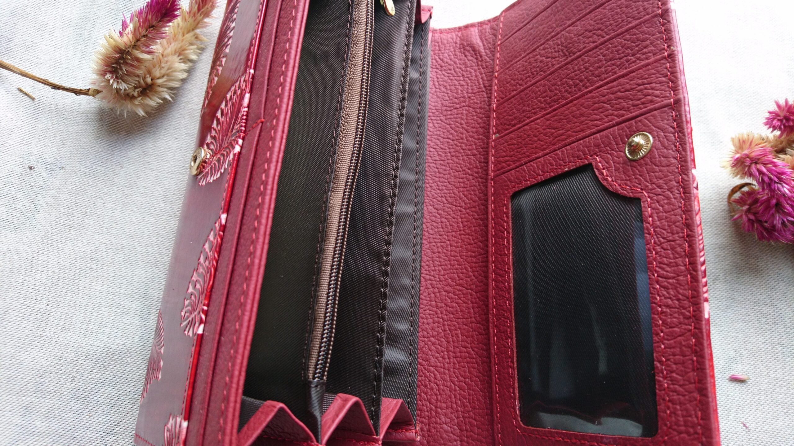Efektne ja elegantne, nii seest kui väljast punasest täisnahast rahakott naistele, mille mõlemal välimisel poolel on faktuurne ja mitmevärviline sulgedega muster. Münditasku lukuga, 13 kaarditaskut, salatasku ning 4 vahet sularaha jaoks, kinnitus klapi ja trukiga.