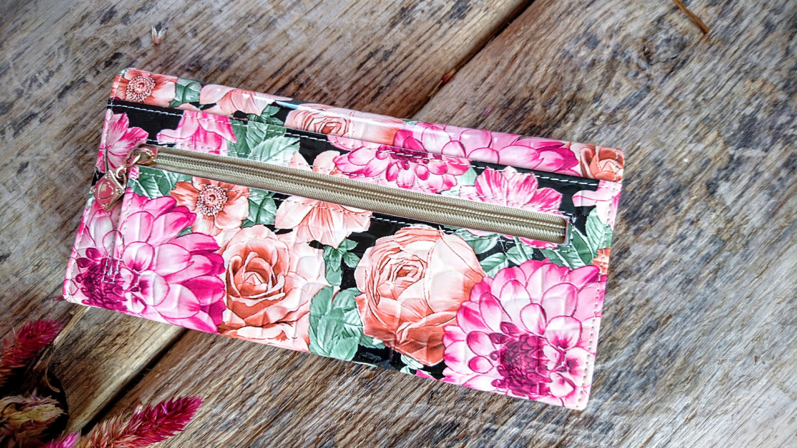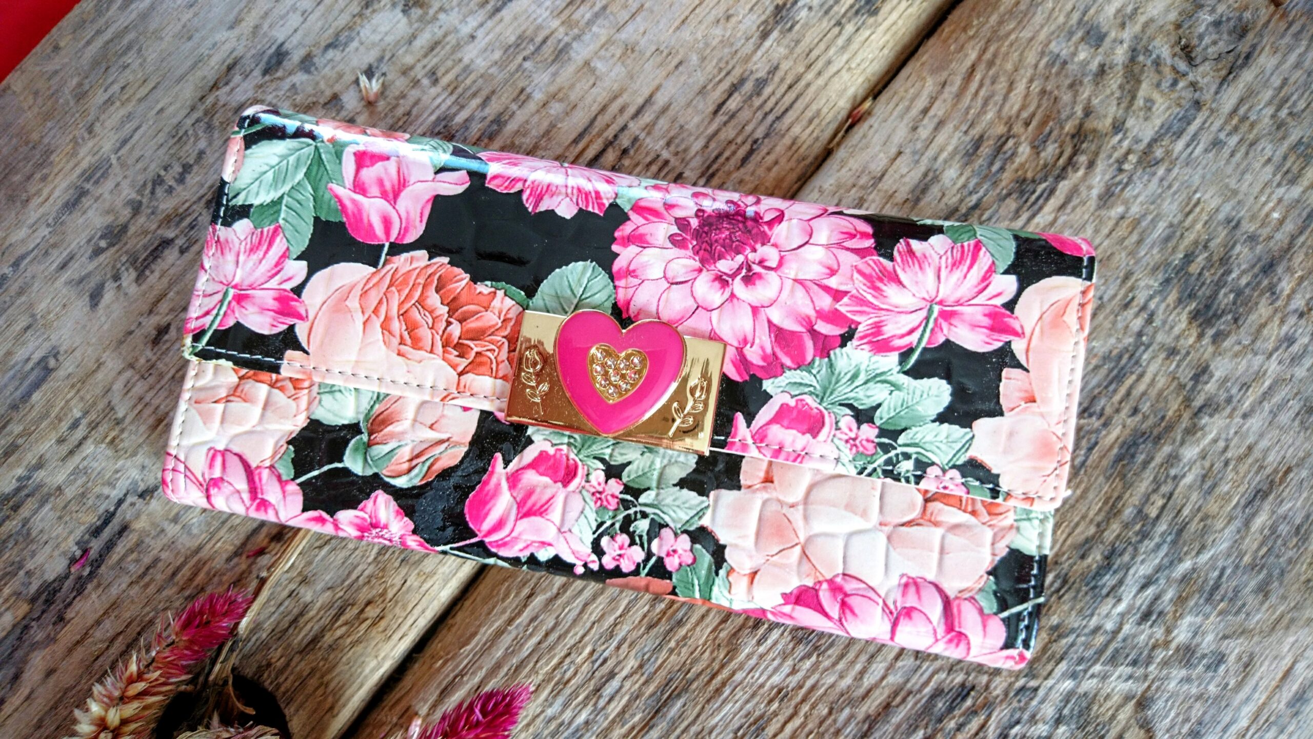 Rahakott naistele roosade lilledega mustal faktuursel foonil