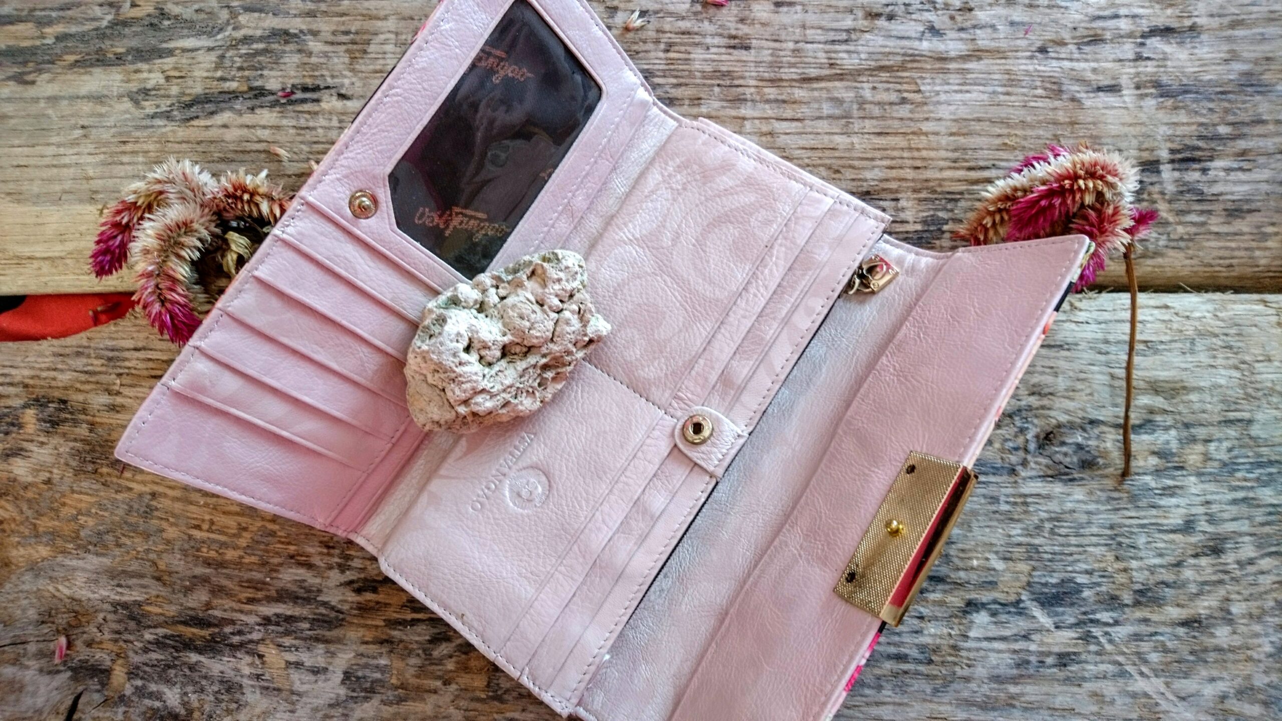 Ühes vahes on lukuga münditasku ja kaks sularahavahet, teises, eraldi trukiga kinnitatavas vahes on 12 kaarditaskut, millest üks on läbipaistev, kinnitus efektse kuldse kinnituse ja roosa südamega klapi ja trukiga. Tagaküljel eraldi mahukas salatasku lukuga, luku küljes südamega kuldne kaunistus.