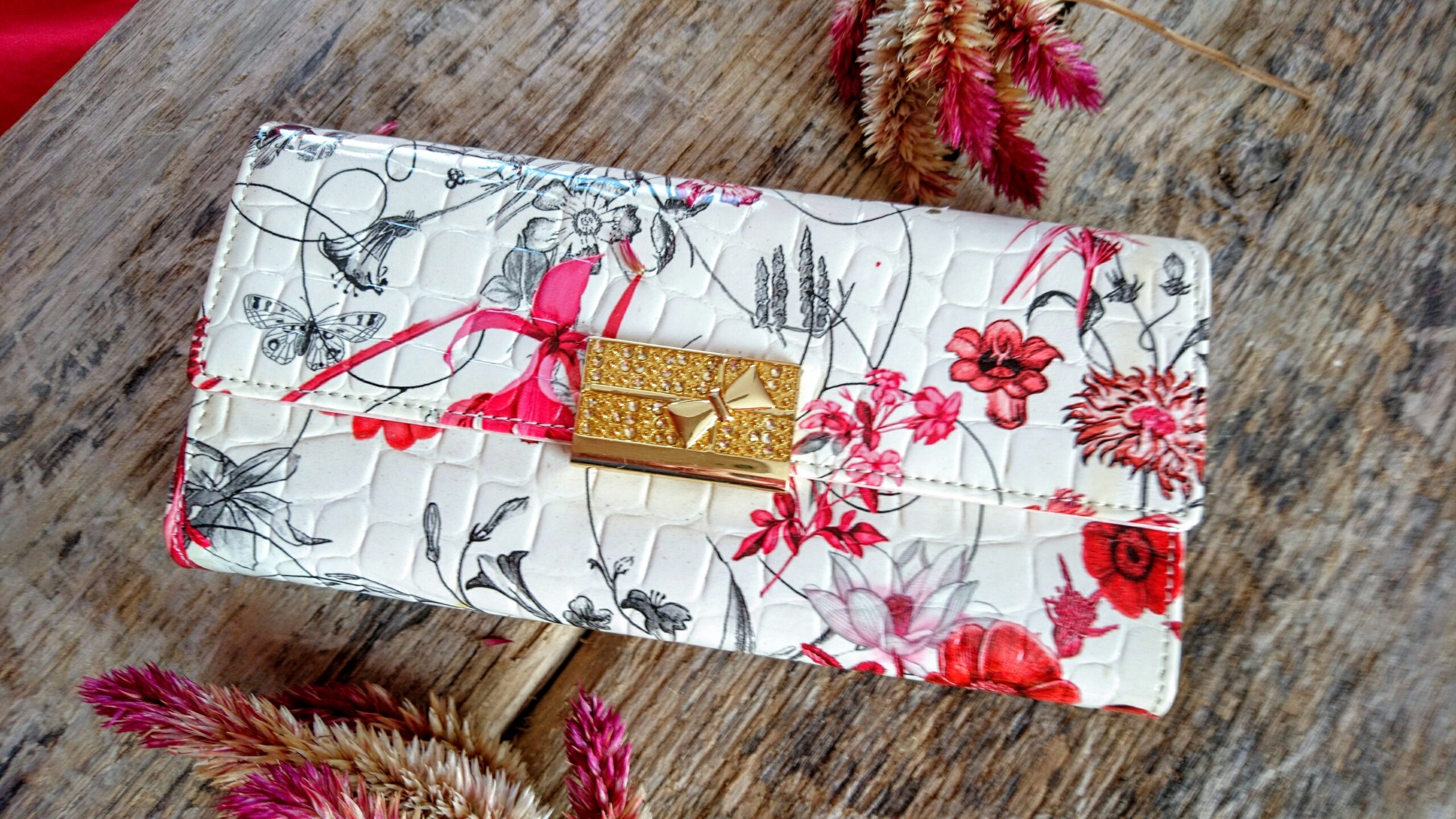 Efektne ja elegantne, väljast kreemikasvalgest ja seest mustriga roosakas-kreemikast täisnahast rahakott naistele, mille mõlemal välimisel poolel on faktuurne punastes (põhivärvina) toonides lillede ja liblikatega muster.