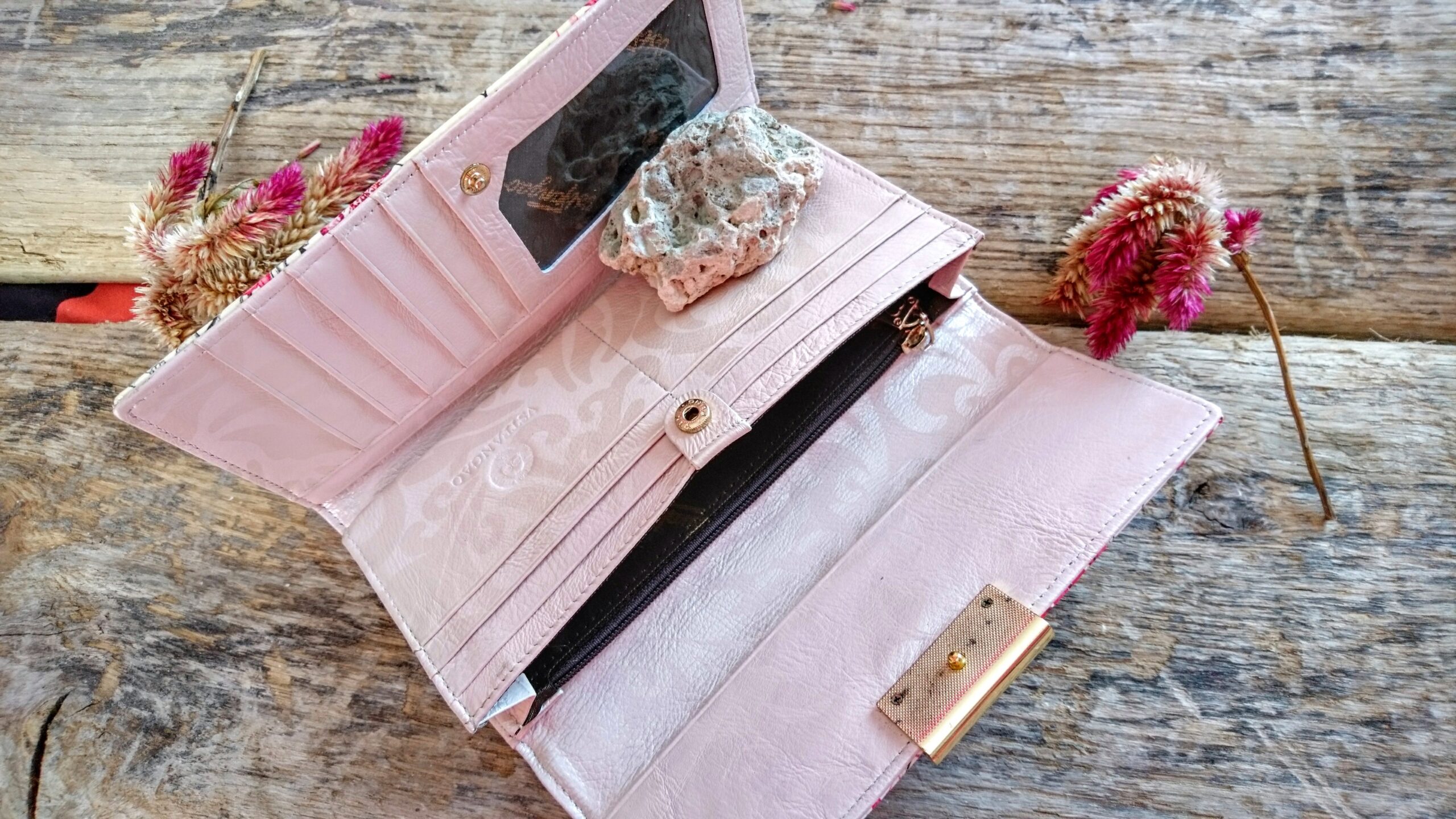 Ühes vahes on lukuga münditasku ja kaks sularahavahet, teises, eraldi trukiga kinnitatavas vahes on 12 kaarditaskut, millest üks on läbipaistev, kinnitus efektse kuldse blingide ja lipsuga kaunistatud kinnitusega klapi ja trukiga. Tagaküljel eraldi mahukas salatasku lukuga, luku küljes südamega kuldne kaunistus.