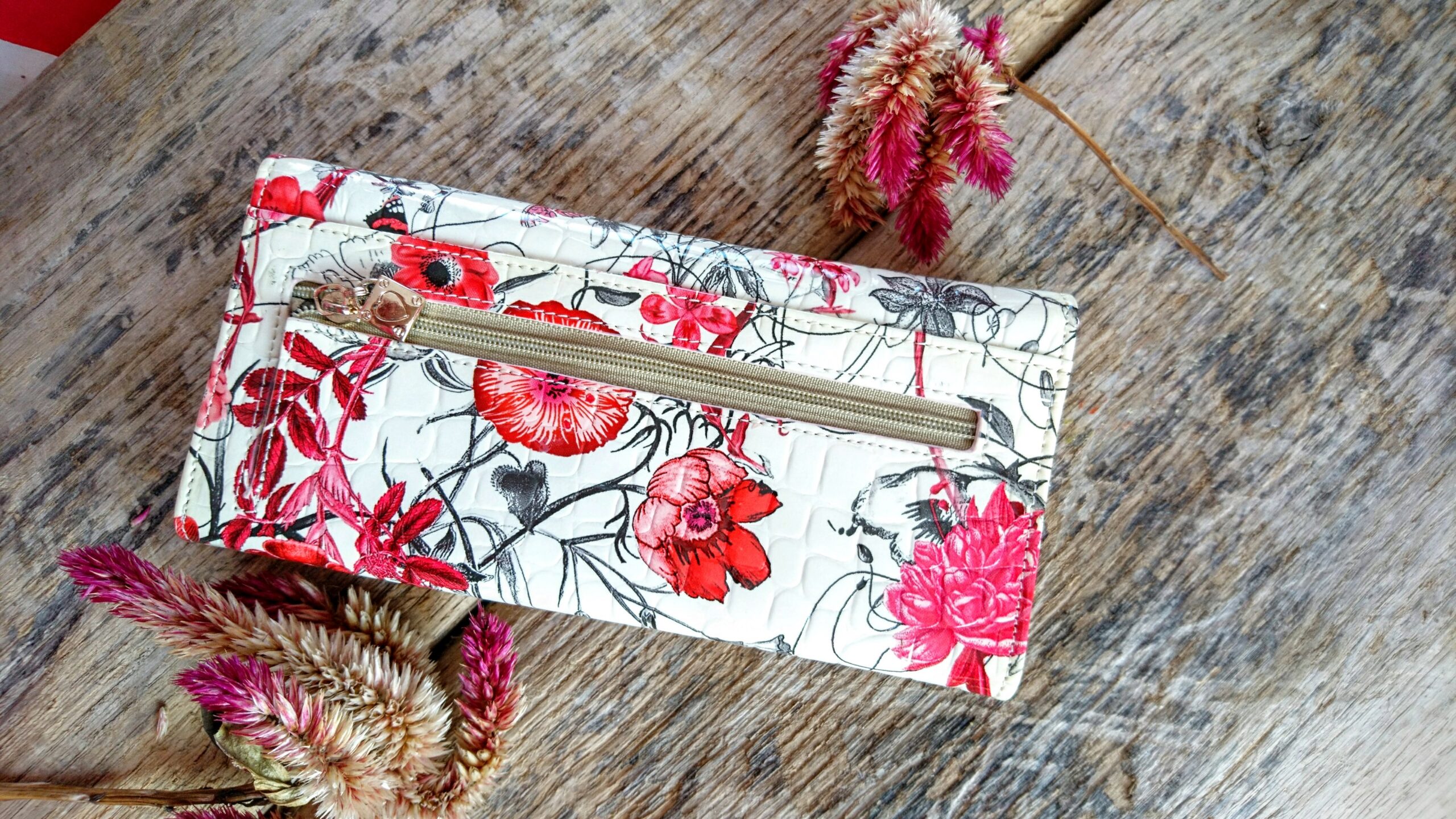 Rahakott täisnahast valgel põhjal punaste lilledega