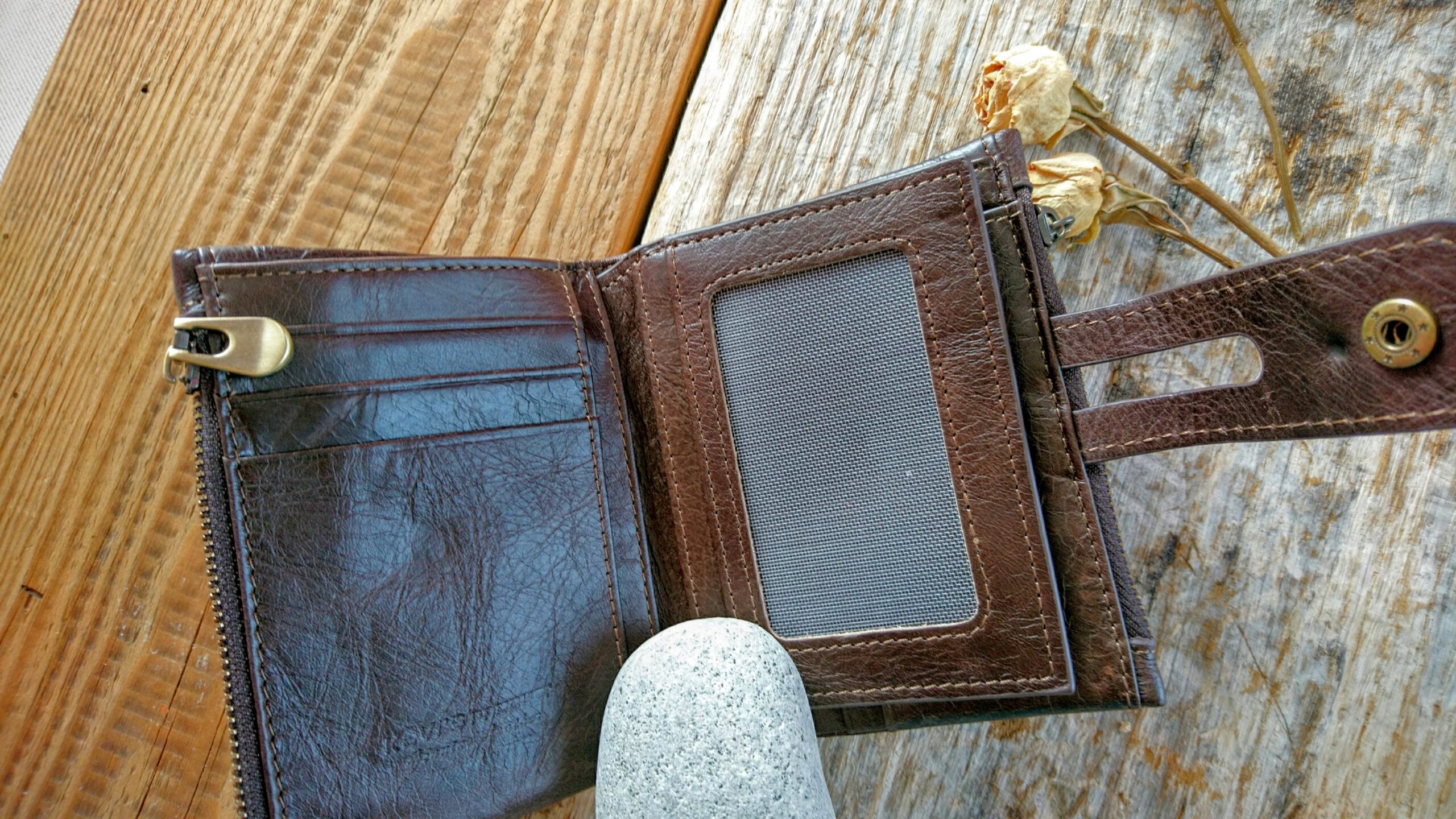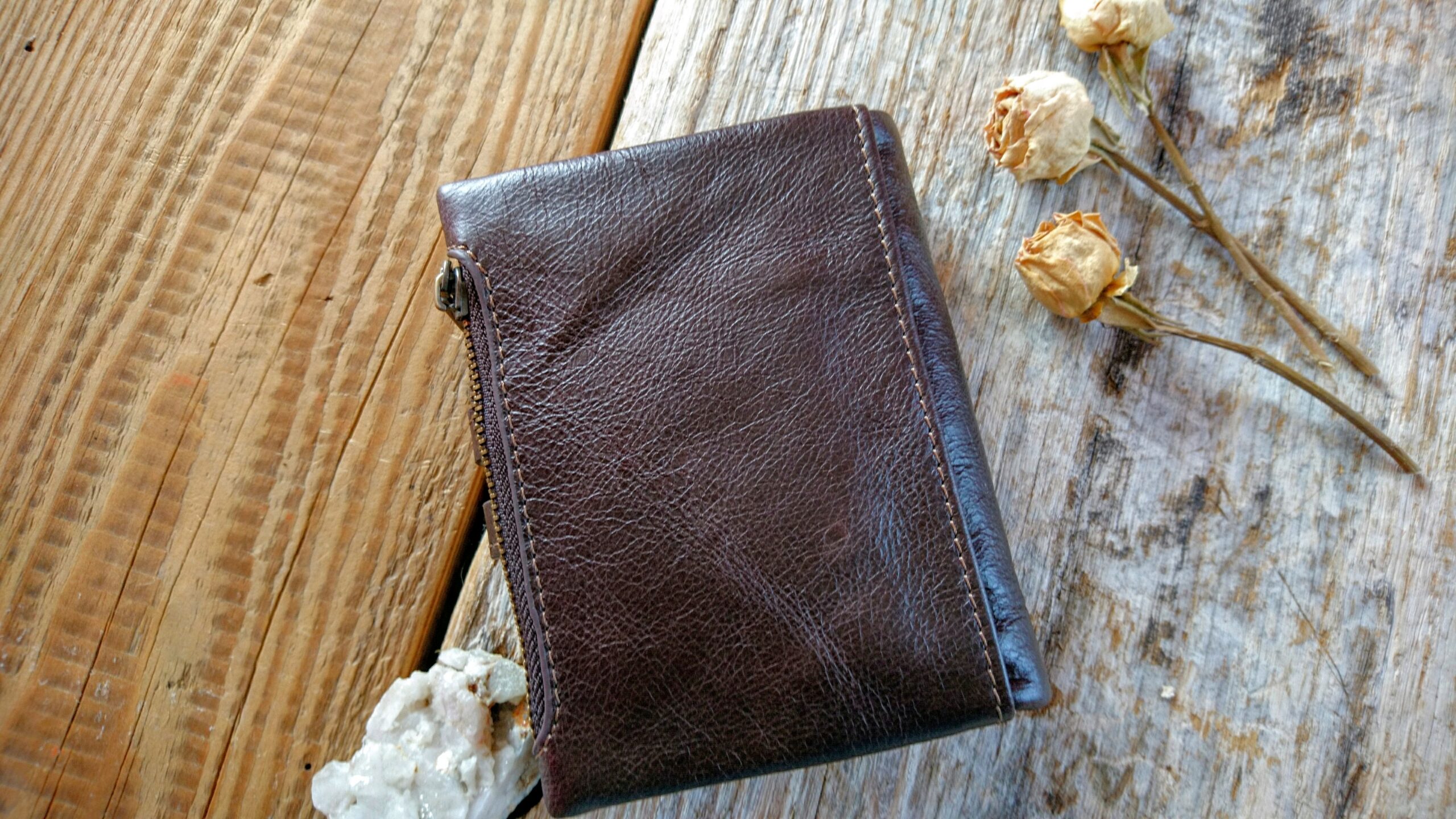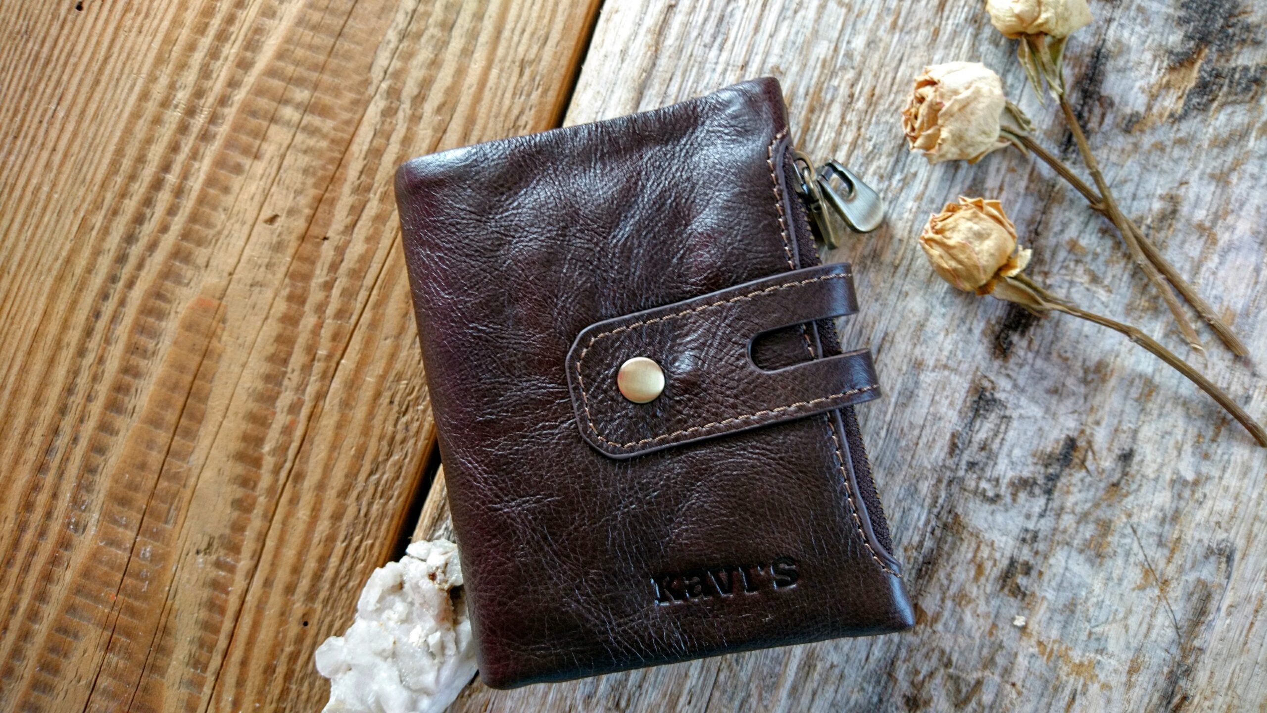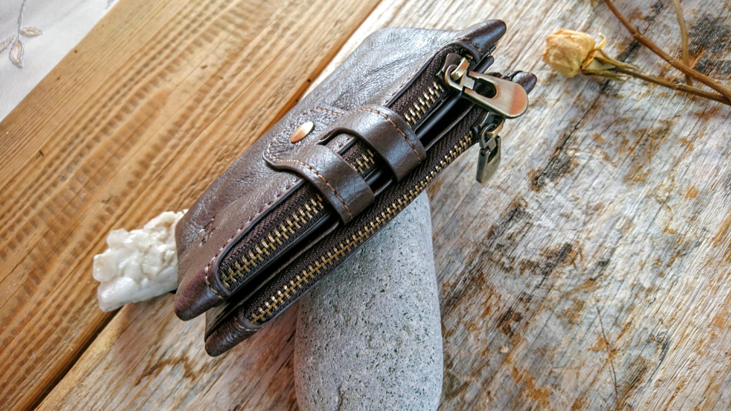 Tumepruunist pehmest täisnahast rahakott meestele. Omapärane rihma ja 2 trukiga kinnitus paksuse reguleerimiseks. Rahakoti kummagil pool on lukuga (mündi)taskud, nende küljes ja keskel on kokku 10 kaarditaskut ning suur vahe sularaha jaoks. Pealsetel tepingud ja tagumisel välisküljel salatasku.