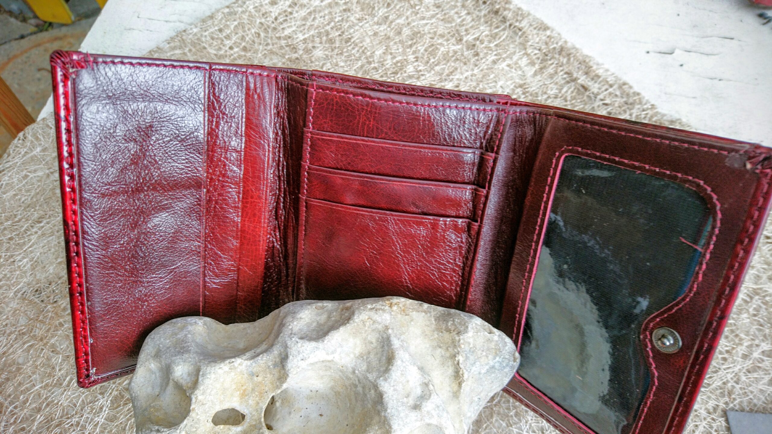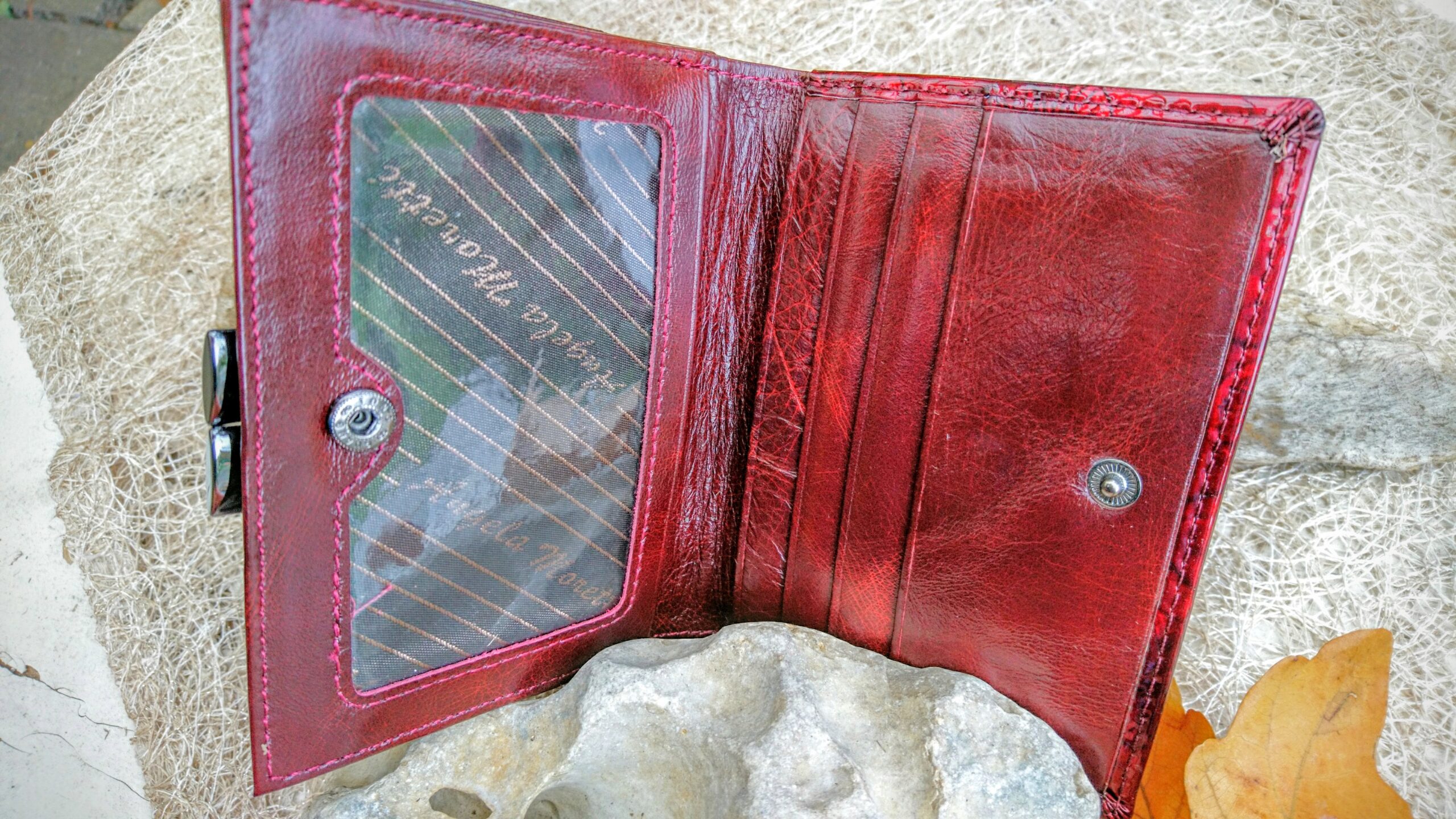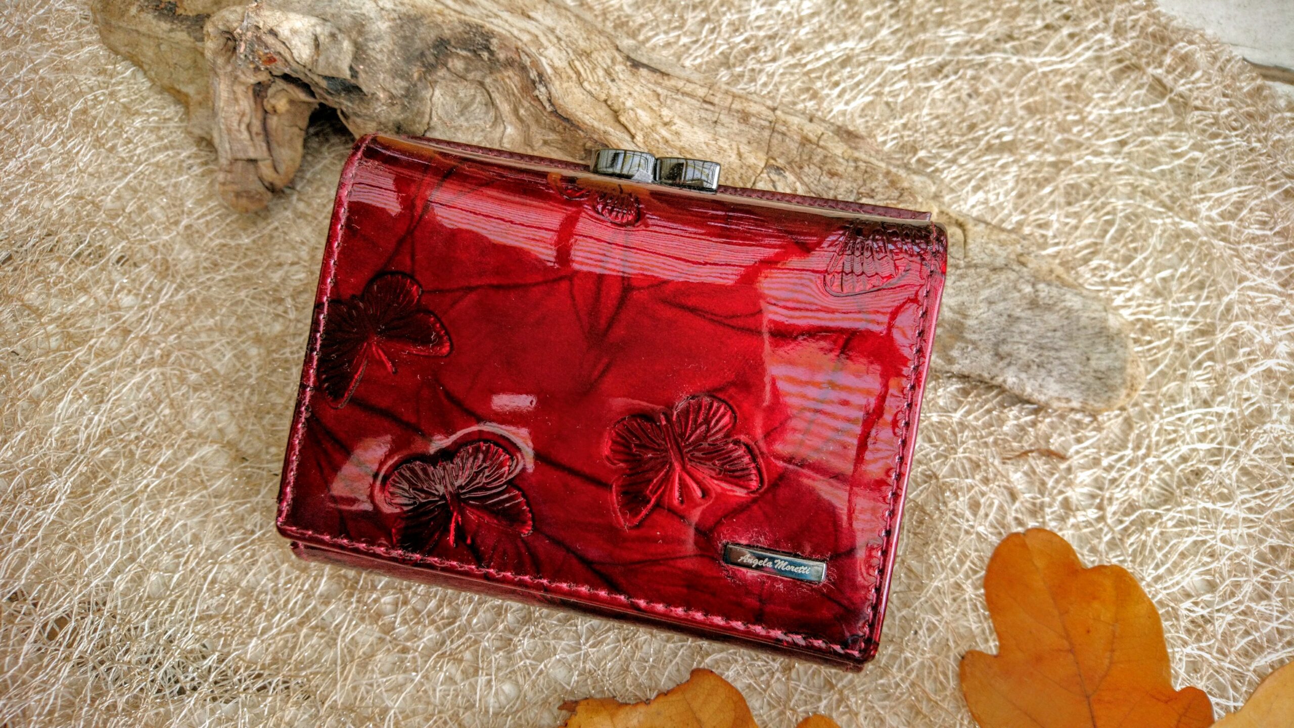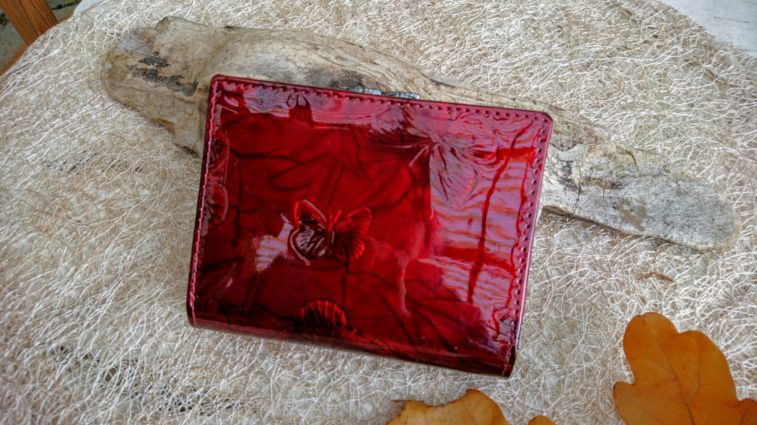 Tumepunasest läikivast naturaalnahast rahakott naistele, millel münditasku antrasiithalli klõpskinnitusega ja kahele poole avanevate 12 kaarditaskuga (ühele ja teisele poole münditaskut). Pealsetel on faktuurne liblikatega muster ja esiküljel metallist iluliistuke. Kinnitus trukkide ja klapiga. Seestpoolt tumepunasest matist nahast.